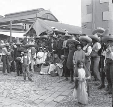 Antes de que estallara la lucha de la Revolución Mexicana, las condiciones socioeconómicas de los mexicanos en general, pero de los potosinos en particular, no eran las mejores condiciones de vida, como se puede apreciar en esta imagen de 1906, captada en la esquina de lo que hoy son las calles Hidalgo y Mier y Terán. Al fondo se puede observar la estructura del antiguo mercado Porfirio Díaz.