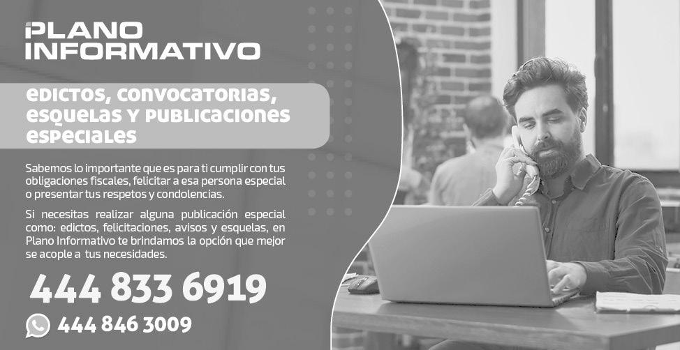 Plano Informativo - Diario Net SA de CV. Publicación diaria. Editor responsable: Francisco Javier Rosales Hernández. Número de Certificado de Reserva de Derechos al Uso Exclusivo otorgado por el Instituto Nacional de Derechos de Autor No. 04-2015-120111395600-101. Número de Certificado de Licitud de Título y Contenido: 16645. Impreso por: Organización Editorial Mexicana, en Universidad 565, colonia Centro, San Luis Potosí, SLP.CP 78000. Distribuidor de la publicación: Grupo Plano Informativo. Domicilio: Julián Carrillo No. 120-A, Colonia del Valle, San Luis Potosí, SLP. CP. 78200. Las opiniones expresadas en este documento son de exclusiva responsabilidad del autor y no representan la opinión de Plano Informativo.