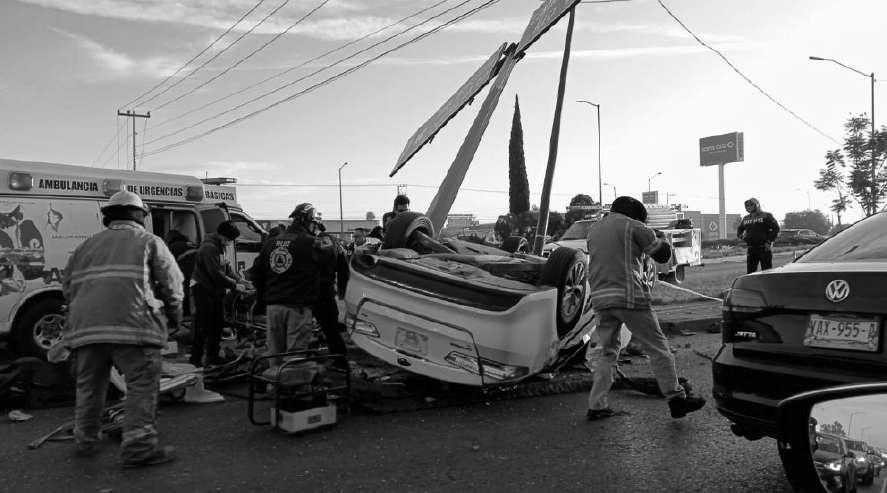 Un trágico accidente vial ocurrió en la lateral de la Carretera 57, a la altura de la colonia Dalias, cuando un vehículo se impactó violentamente contra un poste de señalización, provocando una volcadura de gran magnitud. El accidente dejó como saldo preliminar dos personas sin vida y generó una intensa movilización de los cuerpos de rescate. Una de las víctimas quedó prensada en el interior de la unidad, lo que obligó a los servicios de emergencia a usar equipo especializado para su extracción.