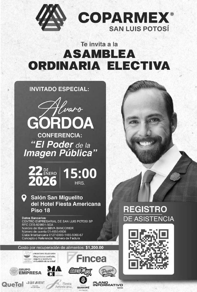 Este jueves, el Centro Empresarial de San Luis Potosí celebrará su Asamblea Ordinaria Electiva, que contará con la conferencia magistral “El Poder de la Imagen Pública”, a cargo del consultor Álvaro Gordoa, en el Hotel Fiesta Americana a las 15:00 horas, como parte del proceso de renovación y fortalecimiento institucional del organismo.