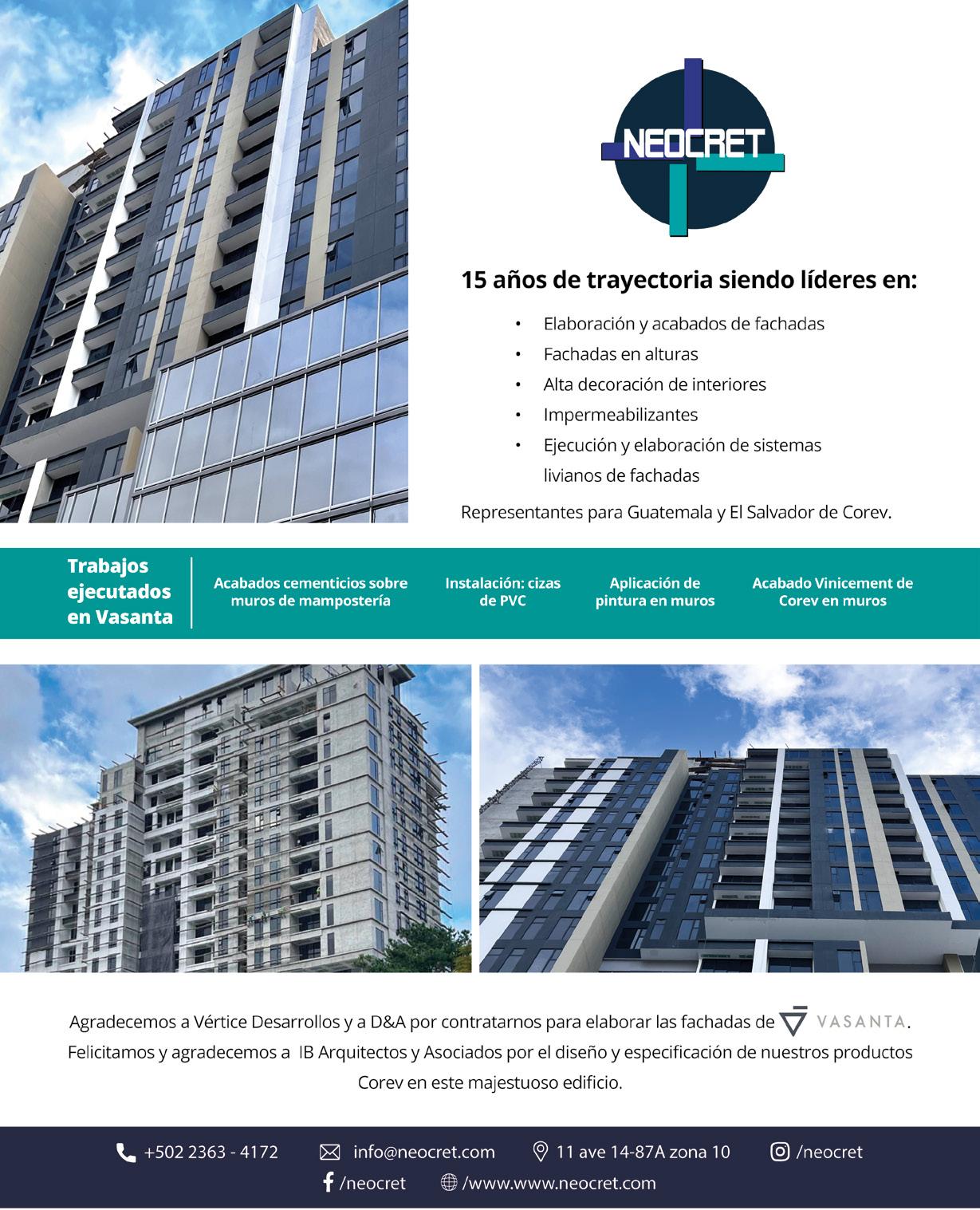 zona 10, cuenta con más de 50,000 m2 de construcción que incluyen 135 apartamentos, 77 oficinas, 2 niveles comerciales, 10 sótanos de estacionamiento y diversas amenidades. También cuenta con un acceso peatonal inclusivo que hace que la visita a Vasanta sea placentera y funcional. Para quienes se atreven a pensar en grande, este edificio de ensueño es donde puedes transformar tu vida y empezar a escribir una nueva historia. Un proyecto que permite encontrar en un solo sitio todo lo que necesitas: estilo de vida, funcionalidad y comodidad, al mismo tiempo que modifica el horizonte de una ciudad que constantemente crece y avanza.