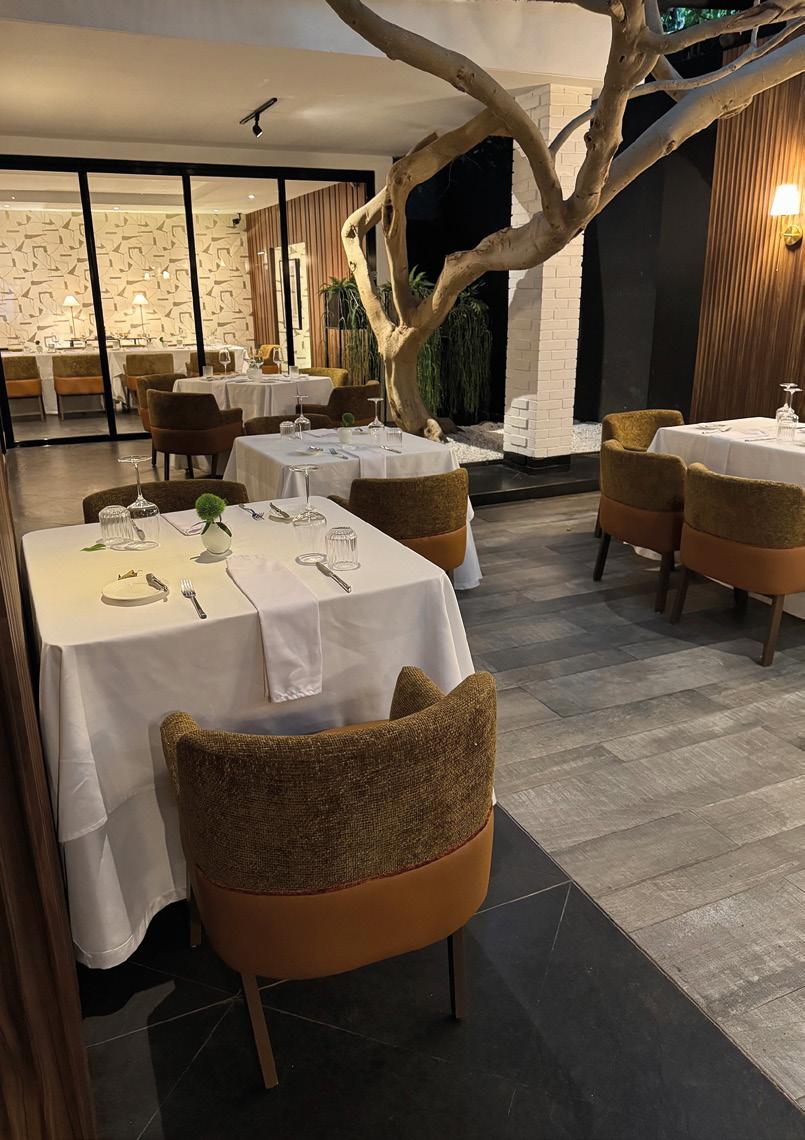 El restaurante recibe a los visitantes con una lámpara de cristal, un recibidor en mármol rosso de origen guatemalteco y llama especial atención el mobiliario que fue hecho a la medida con un revestimiento de seda y cuero, y va variando en su diseño y color.