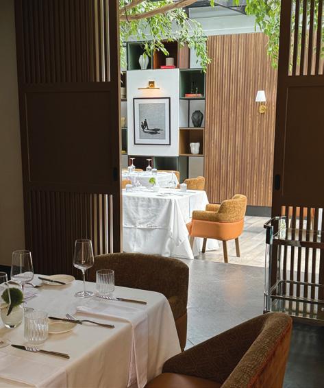 Dentro del restaurante, los espacios son adaptables mediante paneles de diseño lineal y puertas corredizas con efecto traslúcido, que generan expectativa por lo que sucede alrededor. Además, cuenta con tres salones privados, uno en particular ha sido creado bajo el concepto de speakeasy, para atender a los invitados especiales de los chefs. Cuenta con cómodas y amplias sillas color burdeos, un tapiz que recuerda un paisaje e incluso una bandeja inglesa que reitera la intención de generar sensaciones de hogar.