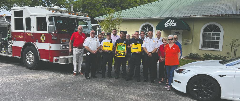 In the parking lot standing next to an electric Tesla, Dustin Hill, a re ghter and chief-in-training and Deputy Chief Timothy Mossgrove, met with Elks’ President George Domedion and T.J. Lopez and J.D. Martin, co-chairs of the of the Elks’ wild game committee. That committee was responsible for raising the funds to buy the Emergency Plug, which cost just under $1,000 each and have adapters to t more than 90 percent of the cars’ batteries.