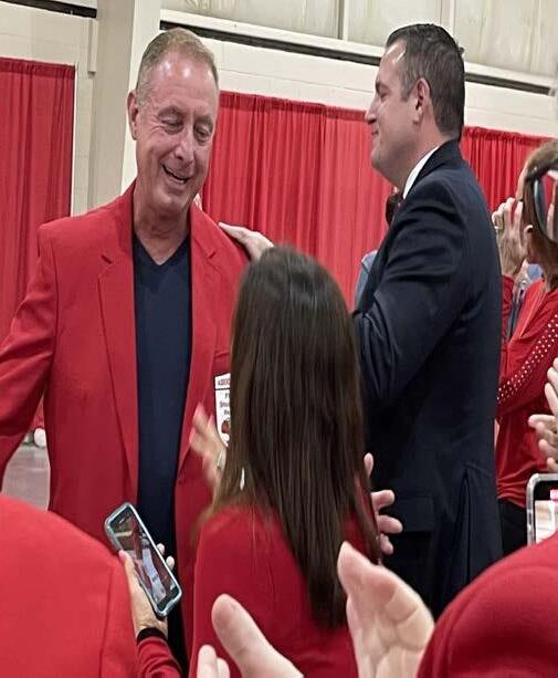 Jack Holland congratulates Rick Lott who was recognized as Outstanding Citizen of the Year for 2023.