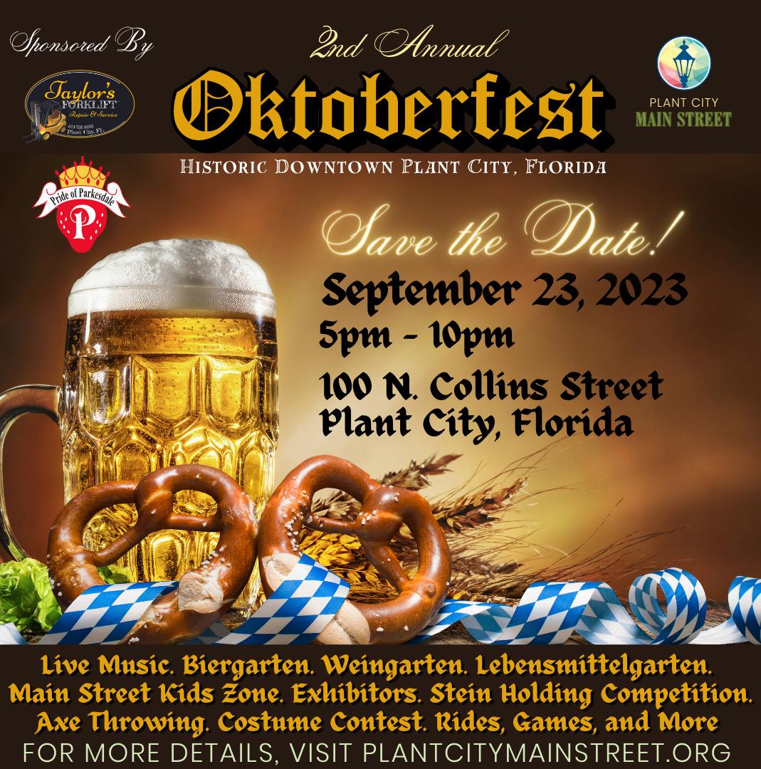 5 to 10 p.m. at 100 N Collins St. Head to Downtown Plant City for Plant City Main Street’s second annual Oktoberfest, an exciting evening filled with lie music, traditional Biergarten and Weingarten experiences, delicious food and more. The family-friendly event will not only feature live music and both a Biergarten and Weingarten, but a variety of German delicacies, a Main Street Kid Zone, exhibitors, a stein-holding competition, axe throwing, a costume contest, rides, games and more. If your business or organization would like to align with this new Plant City tradition, sponsorship availabilities remain available. For more information, visit www.plantcitymainstreet.org/events.