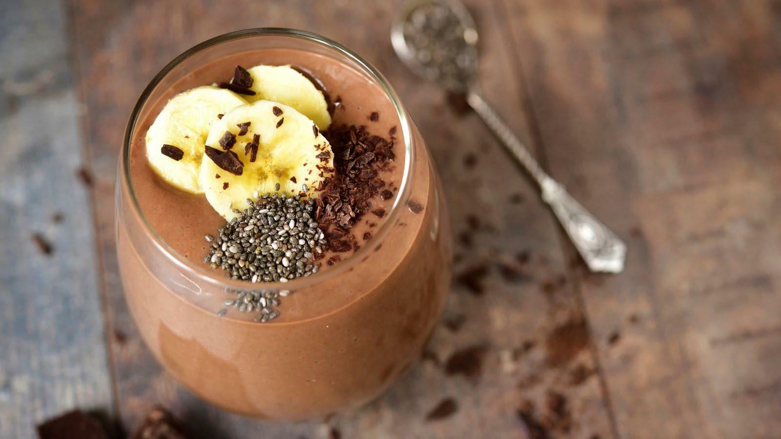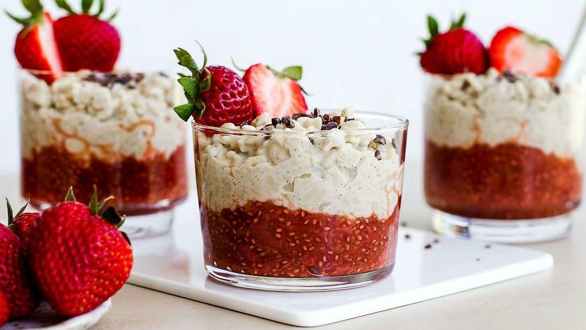 2. In 4 glasses layer the chia jam then rice pudding and top with cacao nibs. Garnish with extra strawberries.
