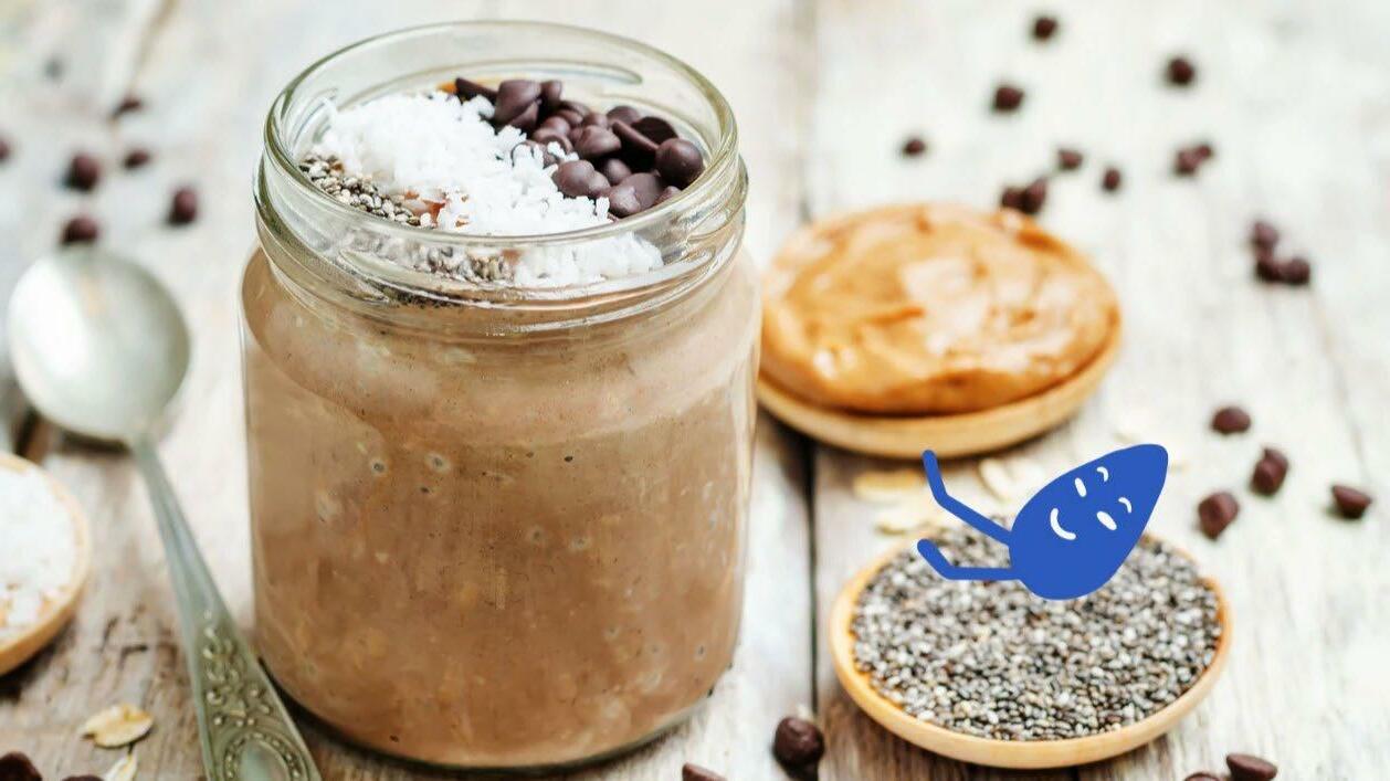 cup water 2 Tbsp chia seeds Strawberries, for garnish 2 Tbsp cacao nibs, for garnish