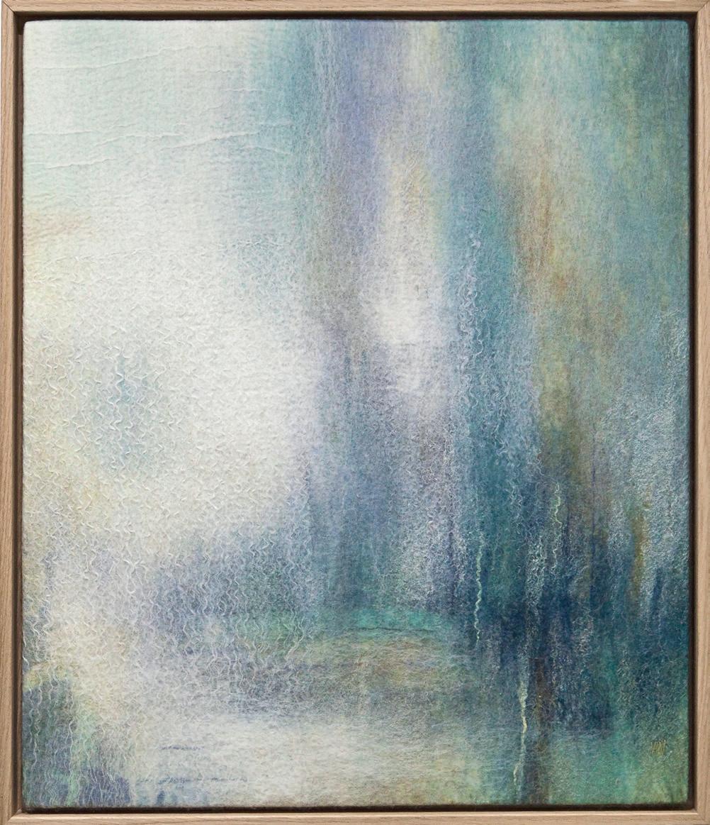 Valérie Wartelle’s wet felt artworks draw you in. At first glance, you perceive the works to be constructed of layers of paint. On closer inspection, you become aware of the way the light dances on the surface of her works. The blurring effect creates Turnerlike imagery, giving each piece a more profound meaning and inviting you to engage further.