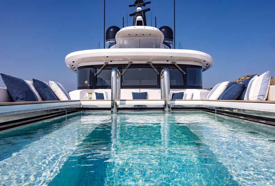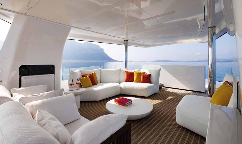 previous two Atlantique units, which were slightly shorter, here we succeeded in making the interior and exterior spaces interact even more, with greater dimensional and volumetric flexibility. This explains the somewhat unusual seating arrangement, which looks both outward but also inward – towards the person sitting nearby, not metres away, like in a luxury hotel lobby, but close enough to speak quietly. A combination of traditional and innovative materials were used, especially for their rare use in the naval field. Large glass surfaces, aged leather, metallic lacquers: all to amaze and surprise a bit. To create a distinction between visual and tactile sensation, for example, and surprise the guest who tries to touch a metal panel finding it warm to the touch. Contrasts that are part of the scenography and choreography of Acqua Chiara.