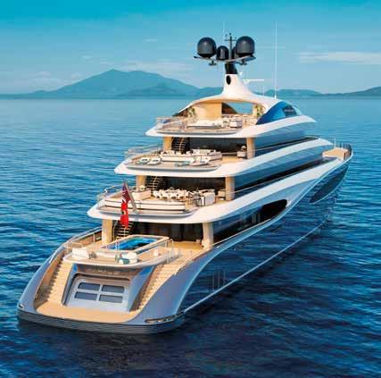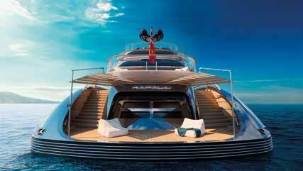 Currently under construction at Turquoise Yachts, the 81-metre superyacht Rafale marks a confident stride into a new era of yacht design. With exterior and interior styling by H2 Yacht Design, the project fuses a futuristic vision with timeless elegance, defined by fluid lines and a bold sculptural identity. Rafale’s most striking feature is her dramatic, cascading sheer line, which sweeps seamlessly from bow to stern, visually extending her five-deck profile. Each deck is organically contoured and wrapped in continuous glazing, reinforcing the yacht’s sleek silhouette while offering uninterrupted panoramic views throughout. The result is a dynamic yet refined exterior that celebrates movement, light, and openness. Built with a steel hull and aluminium superstructure, Rafale is being constructed to Lloyd’s Register classification and will sail under the Cayman Islands flag. Her hybrid propulsion combines twin MTU 12V4000 M65L engines with battery capacity of up to 1,920 kWh, enabling flexible cruising modes, greater efficiency, and reduced emissions. Outdoor living sits at the heart of the design. The yacht features a generous water-level beach club with threesided access, three swimming pools across the main, owner, and sun decks, and a harmonious mix of shaded and openair spaces dedicated to dining, entertaining, and relaxation. Inside, the design mirrors the same philosophy that balances versatility and calm. The owner’s suite, complete with private office, separate dressing rooms and bathrooms, and direct access to a forward terrace with private pool, sets the tone for a contemporary onboard experience. Six additional guest cabins and multiple lounges are spread across the main, owner, and bridge decks, all connected by a sculptural spiral staircase at the yacht’s core. turquoiseyachts.com