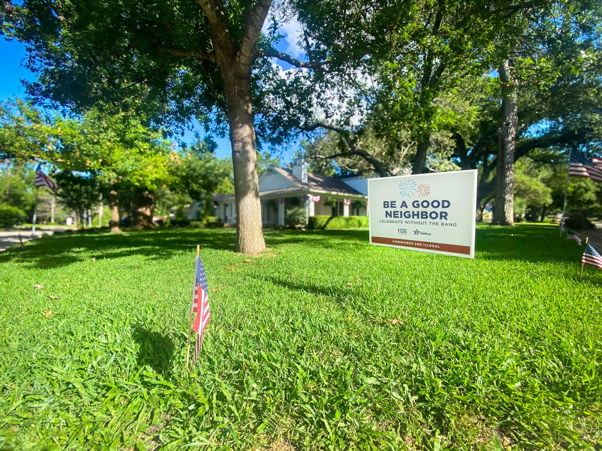 Fireworks are illegal within Temple city limits. For the safety of yourself and others, the City of Temple asks you to consider your neighbors during the July 4th celebrations, including pets, vets, and children. Grab a free yard sign from one of our pick-up locations.