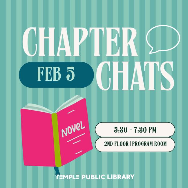 Join fellow readers at the Temple Public Library for Chapter Chats, a monthly book discussion group designed for engaging conversation and shared discovery. Building on the library’s Wandering Reads Book Club, this subscriptionbased group explores a wider range of themes including history, culture, and ideas in a relaxed, welcoming setting.