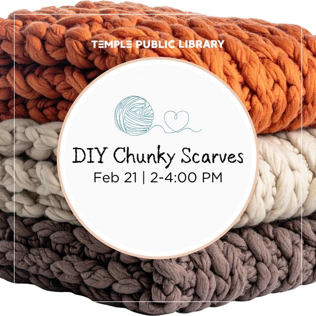 Get creative at the Temple Public Library with the DIY Chunky Scarves program, where participants will make their own cozy scarf using the finger crochet method no experience required. This hands-on workshop is open to adults ages 18 and up, and registration is required to join. Learn a fun new craft while creating a stylish, handmade accessory. The program will be held Saturday, February 21, from 2–4 p m in the 2nd Floor Program Room.