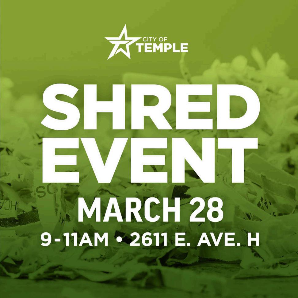 Temple residents are invited to a free Shred Event on Saturday, March 28, from 9–11 a.m. at the Solid Waste Complex. Safely shred up to five banker boxes of personal documents.