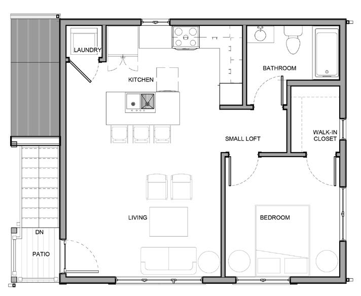 The Bluebonnet is a stylish two-story, twobedroom house offering a unique, modern living experience with a small footprint. This home design incorporates large windows, open kitchen and living room layouts with double-height vaulted ceilings, and ample patio space to promote connection to the outdoors. The second story features an artist’s loft open to the floor below along with a second bedroom.