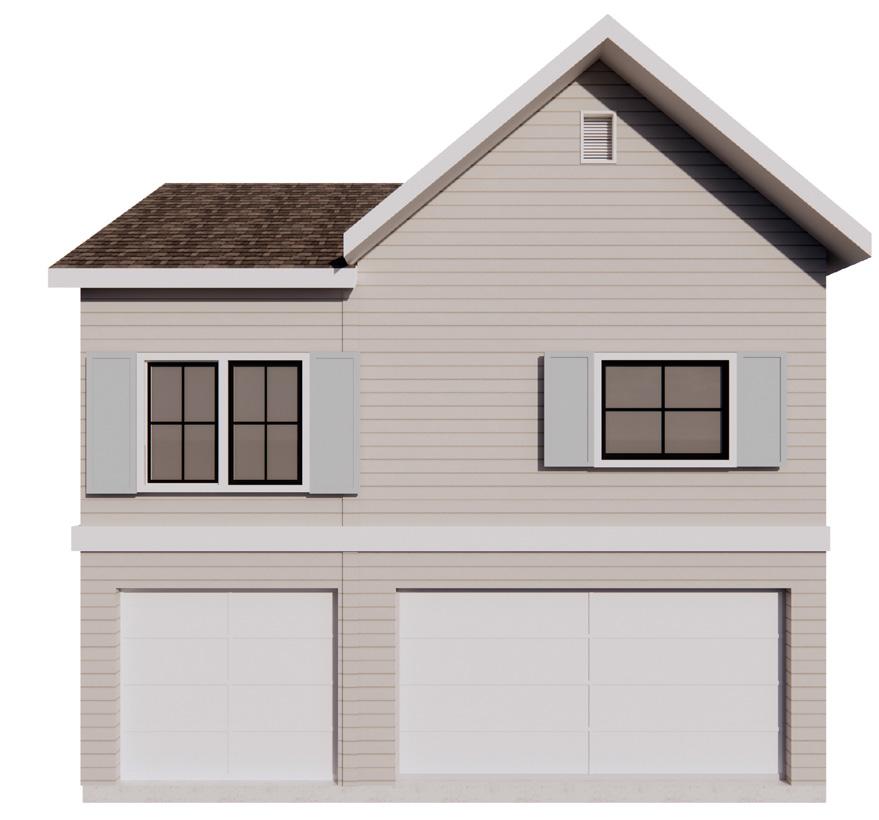 The Palmetto is a carriage house with internal stair access to a two-bedroom living space above the garage. This layout features an open kitchen and living room area leading to a second story balcony, along with a spacious primary bedroom with walk-in closet and second bedroom.