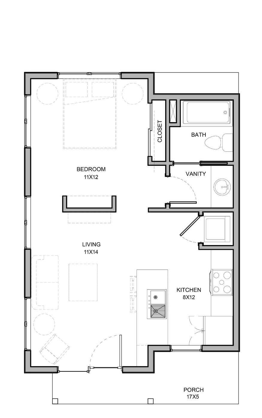 The Hawthorn is a one bedroom accessory dwelling unit offering a spacious, modern living experience in a compact footprint. A front stoop at the entrance opens up to a continuous living and kitchen area, surrounded by windows providing abundant natural light and openness. In the rear of the unit, the open bedroom is concealed behind a privacy wall.