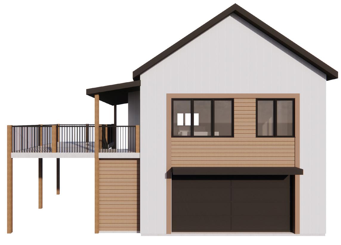 The Abelia is a carriage house with an open living space above the garage/storage area. The unit is accessed by a covered exterior staircase. The kitchen and living room share an open plan layout on the second floor, with a large primary bedroom and walk-in closet. This floor plan includes an option for a covered carport for a third car that can double as a large balcony.