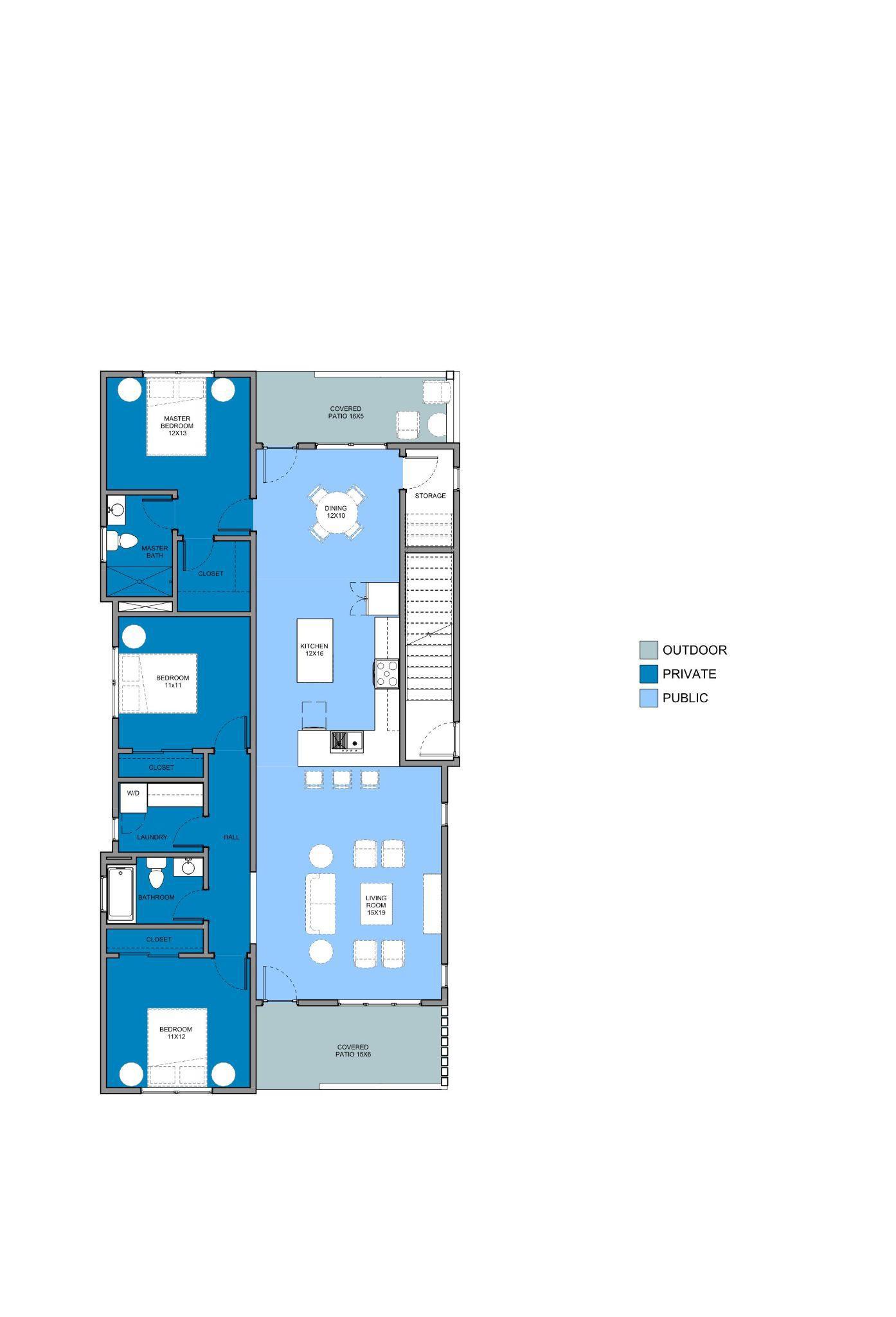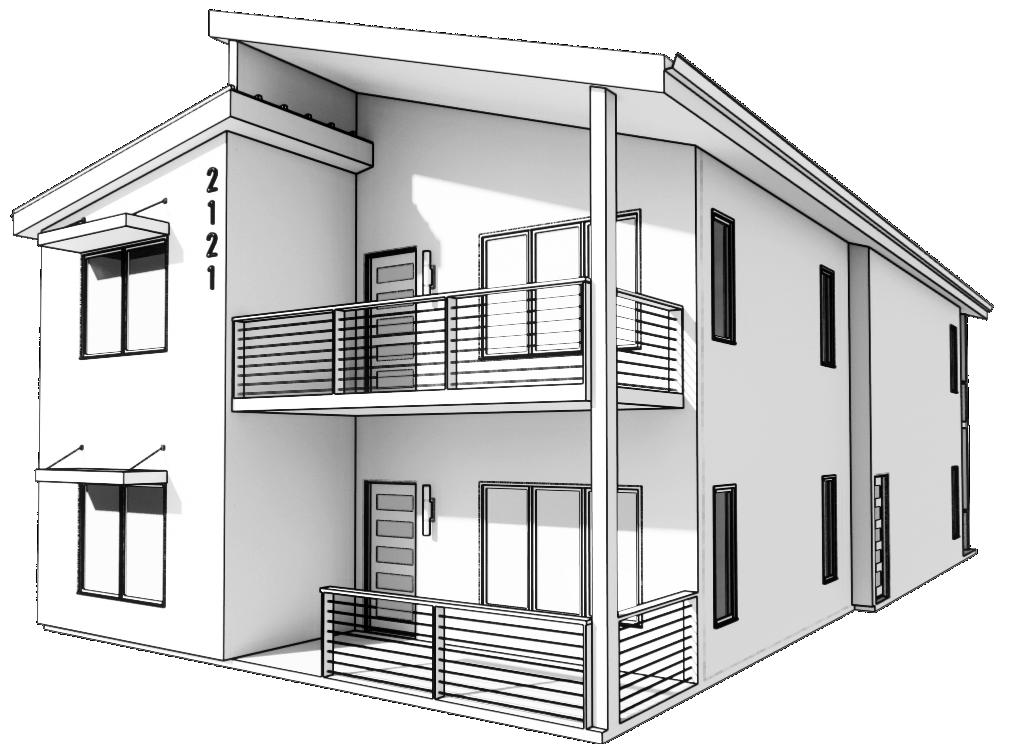 The Live Oak Mutiplex consists of four total units with one, two, or three bedrooms. Each unit has its own covered front porch and rear patio. To complement the bedrooms, the laundry room was placed on the second story.