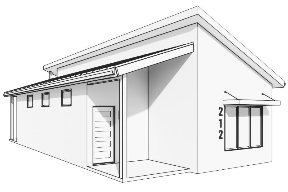 The Yaupon is a stylish single-story, onebedroom cottage home offering a unique, modern living experience with a small-scale footprint. This home design incorporates large windows, open kitchen, and living room layouts with high vaulted ceilings and ample patio space to promote connection to the outdoors. Design Name: Yaupon