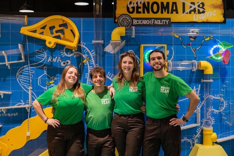 B Il Wonderteam di Dino Camp fotografato davanti al Gino Genoma Lab, divertente laboratorio interattivo per lo smistamento delle palline.