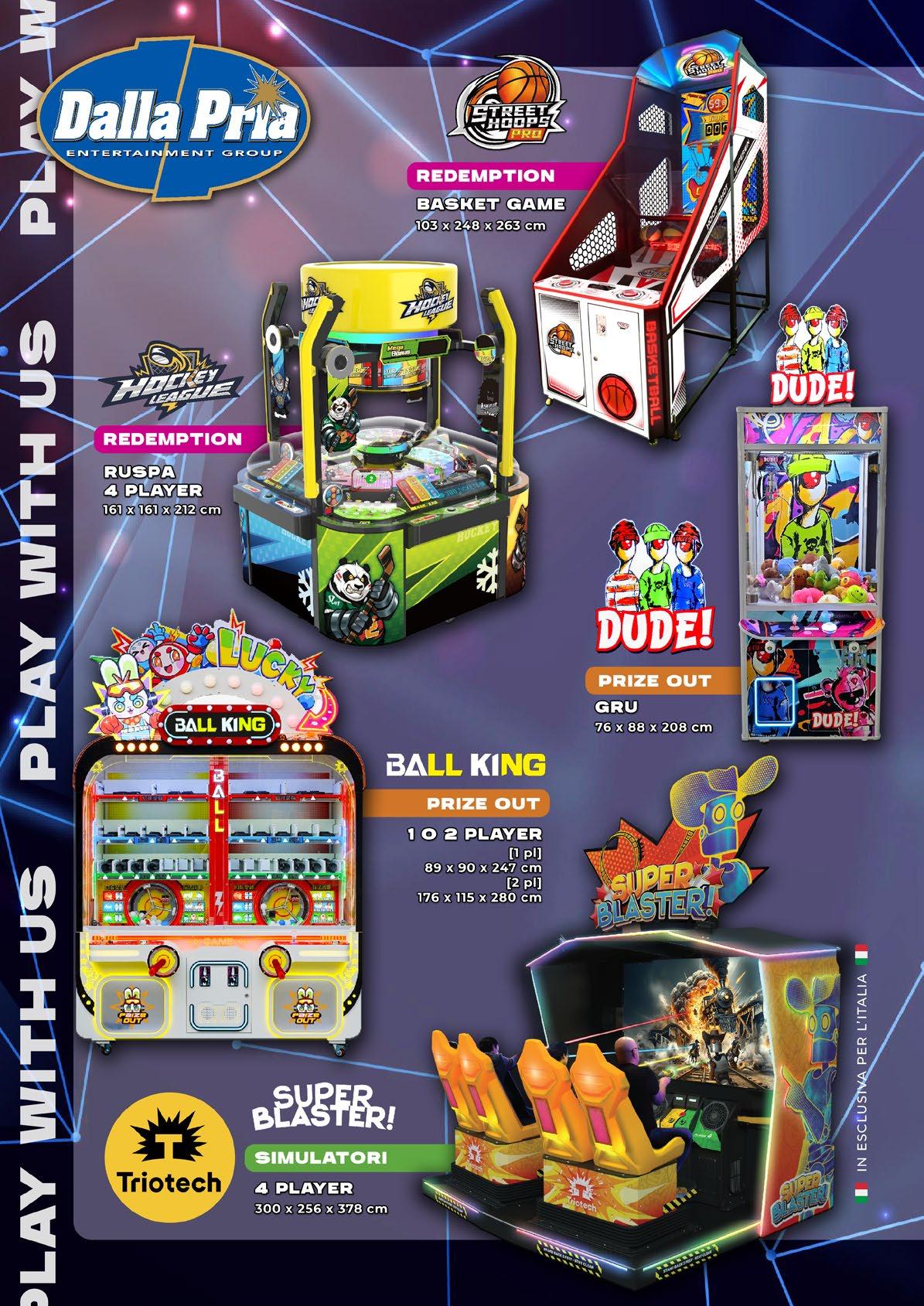 Descrizione: presentata a novembre scorso alla Iaapa Expo di Orlando e pronta per la distribuzione mondiale a partire dal mese prossimo, questa macchina su licenza è una bella attrazione che ha per tema il magico universo dell’iconico film del 1971 “Willy Wonka e la fabbrica di cioccolato” interpretato da Gene Wilder. Ne riprende immagini, video e audio in un cabinet a 4 postazioni colorato e pieno di luci, ideale anche come centrosala. Come si gioca: per vincere ticket servono abilità e tempismo così da manovrare bene la pinza per afferrare le palline colorate sul piano di gioco che ruota. Le possibilità di incrementare il premio sono molteplici: ci sono i cosiddetti “multiplier” e riuscendo a comporre la parola W-ON-K-A scatta il Wonkavator Bonus. Ancora, raccogliendo tutti 5 i personaggi del film viene sbloccato il Golden Ticket Bonus. Questo si presenta come un vero biglietto a tema rilasciato dall’apparecchio che funge anche da “gratta e vinci” con cui la vincita si incrementa. Dimensioni: 235,5x235,5x260(h)cm