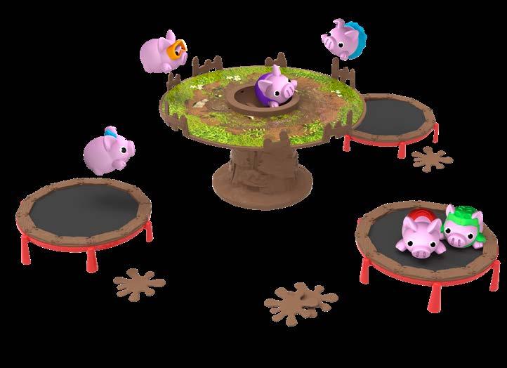 A PIGS ON TRAMPOLINES NEW #23119 • 2–3 Players • Ages 6+ Includes 6 Rubber Pigs, 3 Trampolines, 7 Mud Pies, Pig Pen, Instructions. Size: 10” x 10” x 3” • Case Pack: 3 Available Spring 2023 • Bounce your pigs and try to land in the mud puddle! • Fast-paced, pig-flying fun! B FRAIDY CATS NEW #23121 • 2–4 Players • Ages 5+ Includes Motorized Dog, 4 Cat Movers, 2 Fence Clips, 4 Launchers, 4 Trash Cans, Gameboard, 2 Dice, Instructions. Size: 10.5” x 10.5” x 3” • Case Pack: 3 Available Spring 2023 • Get your cat around the yard without waking Mugs the Pug! Featuring Mugs the motorized pug! Fur-Flying Fun! NEW NEW