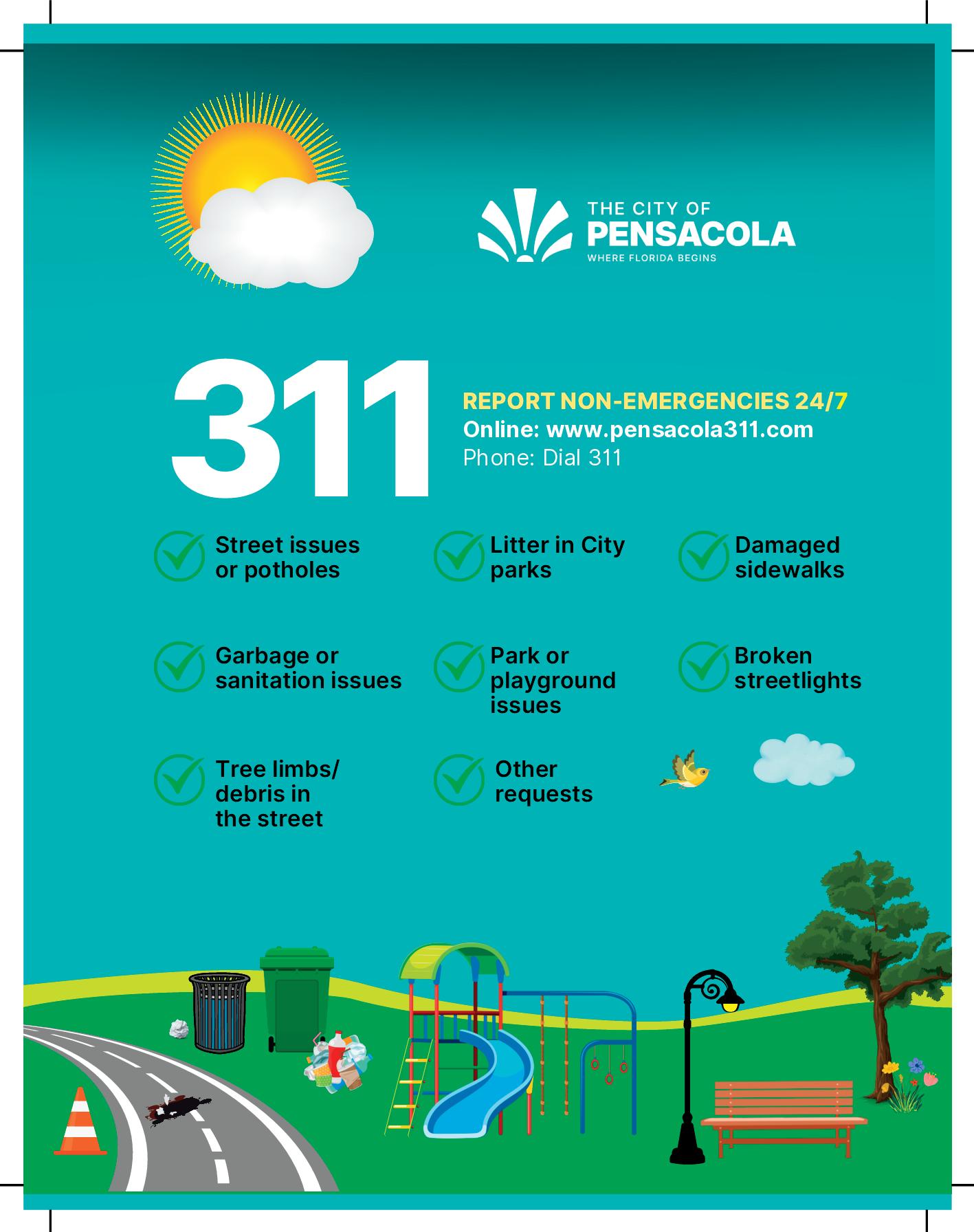• If you see a safety concern, i.e. a tree limb that has come down or a section of a playground is broken, please let us know by calling 311 or (850) 436-5670.