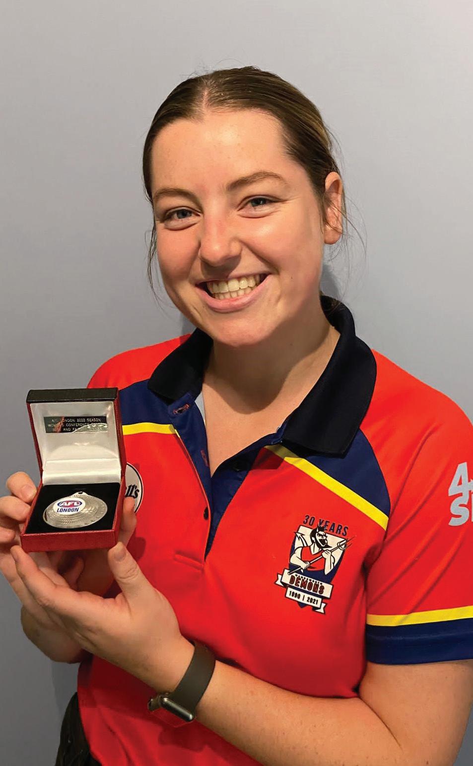 G | For the past five years, Stephanie Boone (2015) has established herself in London while actively participating in AFL football as a member of the Wandsworth Demons AFL team. Renowned for her defensive skills, Stephanie is known as the 'Rock of Boonie'. She recently won the AFL London Conference Best and Fairest award, an accomplishment equivalent to the Brownlow medal.