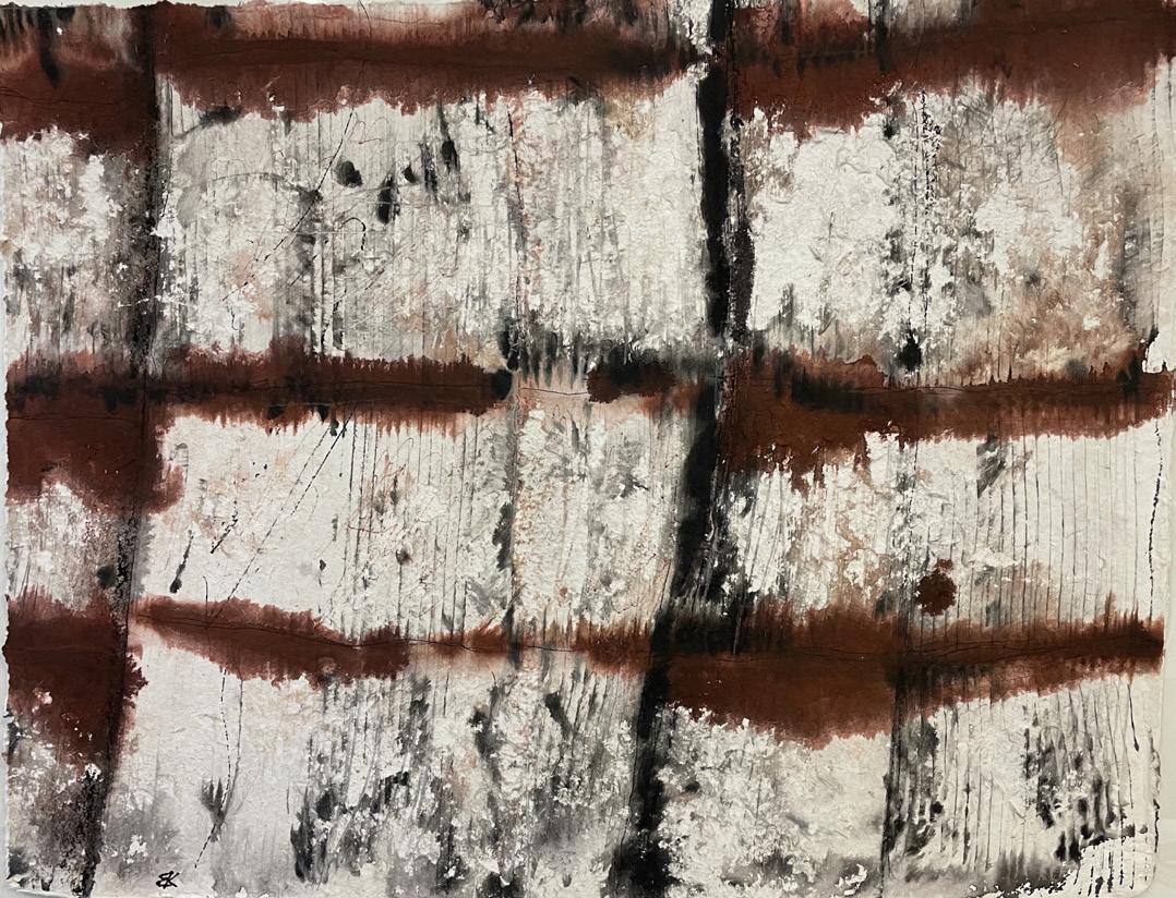 The works I create are existential impressions of landscape in particular time frames and locations. Drawing is collaboration between materials, systems of thinking and chance observations while being in the moment. I am interested in how we make place, inhabit it and change it often with environmental implications. I start my process by walking through and across landscapes. In the field I sketch impressions and collect materials: Sticks,stones, grasses, soils, discarded wire, rusted tins etc. which become both a reference for palettes and textures when back in the studio. I marry conventional drawing media with scorched, scoured, stained and quenched paper surfaces to create a history of marks and erasures. My weathered surfaces experience elemental processes, mimickingnature’s hand through time within inhabited landscapes. My focus is on rural landscapes and how things sit, between humans and nature.