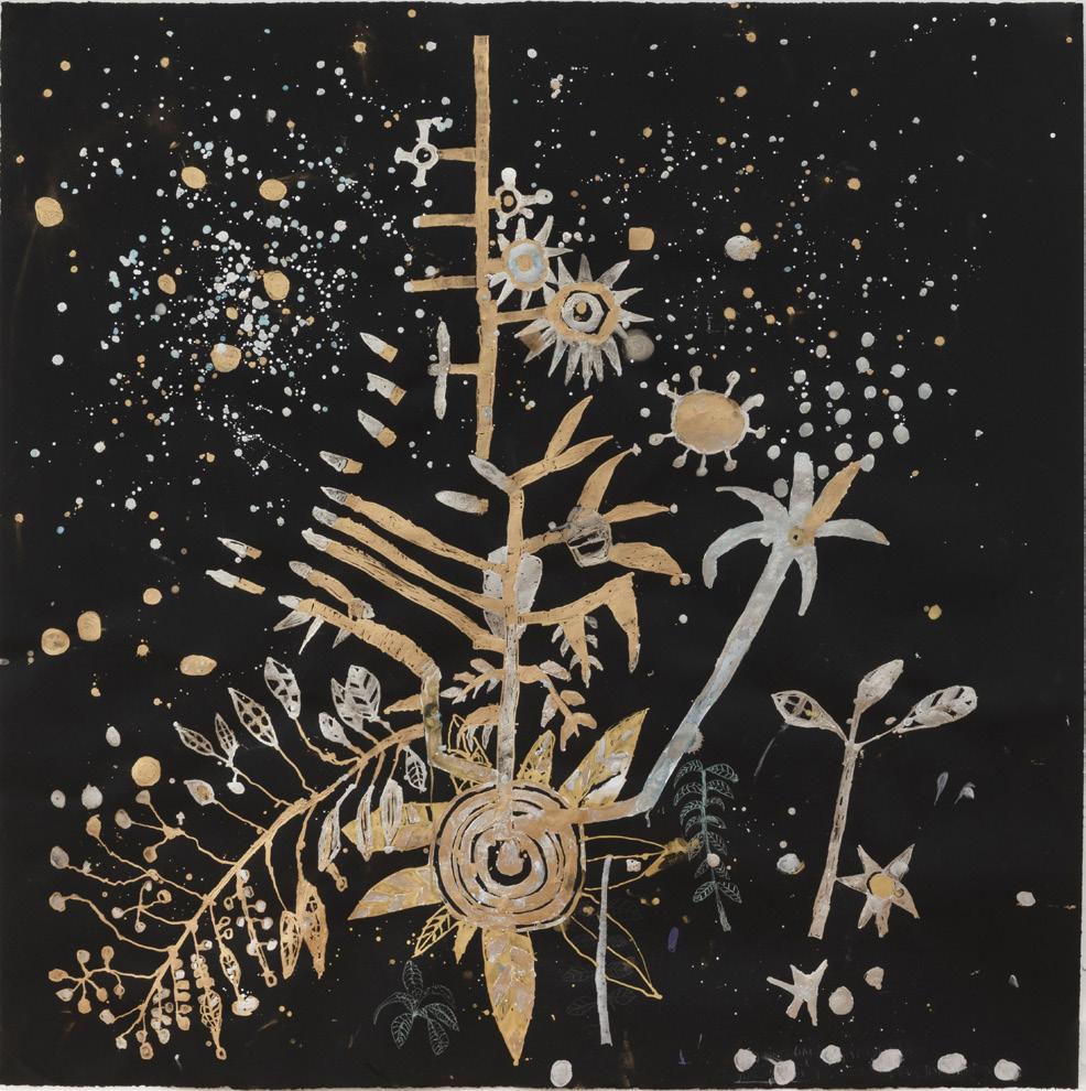 I began a series of drawings at the end of January 2023 after a night camping in the Wollemi wilderness; Wiradjuri country: a culturally significant place for the Wiradjuri, Dharug, Wanaruah and Darkinjungpeople. After three hours of cross-country tramping through years of rain induced growth, we came upon a cave that we were fortunate to shelter in for the night. I awoke around midnight and walked out into the bush. I looked up and I was awestruck by the spectacle. A firmament of galaxies and infinite clusters of stars. I forgot about my normal life where my inspiration comes from the daily news. Instead, all I could see and imagine were the black holes, dark matter, satellites, moons and prehistoric plant shapes.