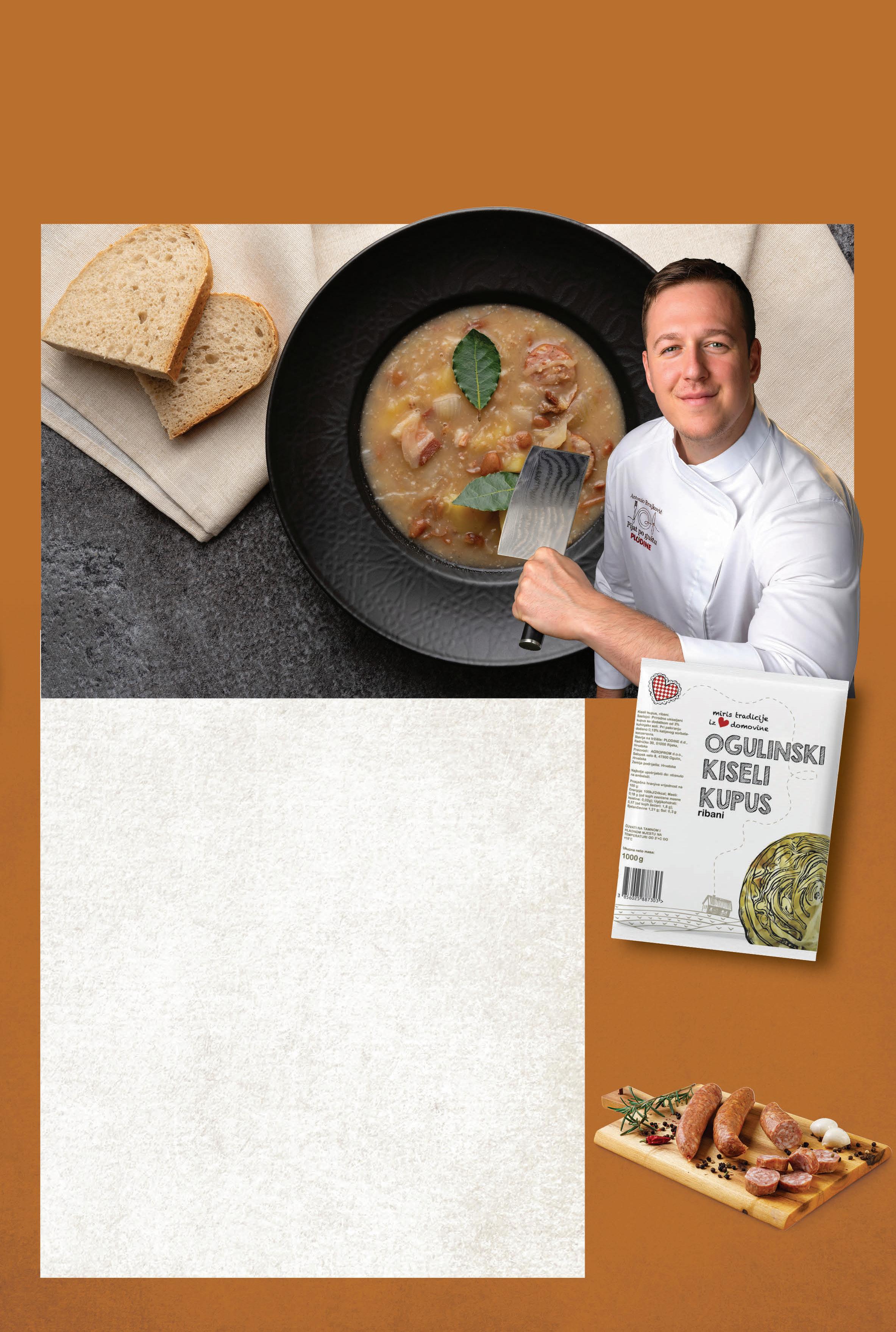 U većem loncu na svinjskoj masti najprije pirjajte sitno nasjeckani luk dok ne omekša. Zatim dodajte kobasice, dimljene kosti i polovicu pancete narezane na komade.