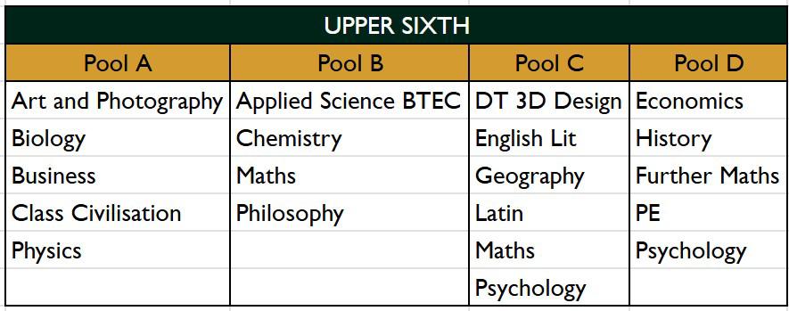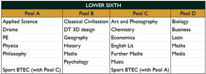At Plymouth College, we offer a range of A-Level, BTEC and Cambridge Technical qualifications. Students have a free choice of 3 A-Level subjects (or equivalent) from the list below. In certain circumstances we may allow a student to start 4 A-Levels. Once initial preferences have been indicated, the subjects are placed into 4 pools. In the great majority of cases it is possible to study your chosen subject combination in these pools. A student’s choice of subjects is subject to the approval of the Head of Sixth Form and Deputy Head (Academic).