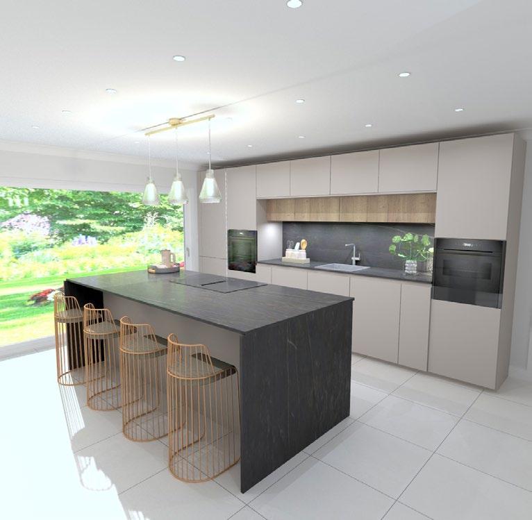 s tone or ceramic worktops , available in a wide range of colours, textures and finishes. From subtle, natural tones to bold statement surfaces, these materials offer durability, heat resistance and a refined finish, often complemented by features such as mitred edges and full-height splashbacks.