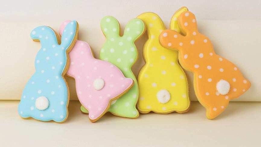 TWO Dust a work surface with flour, then roll one half out to the thickness of a £1 coin. Use an rabbit-shaped cookie cutter to stamp out as many as you can, then transfer them to one of the baking sheets, leaving a little space between the biscuits. Repeat with the other half of the dough.