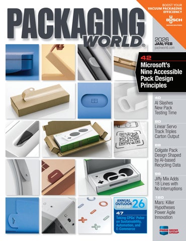 World®, 401 N. Michigan Avenue, Suite 1700, Chicago, IL 60611. PRINTED IN USA by Quad. The opinions expressed in articles are those of the authors and not necessarily those of PMMI. Comments, questions and letters to the editor are welcome and can be sent to: editors@packworld.com. Mailing List: We make a portion of our mailing list available to reputable rms. If you would prefer that we don’t include your name, please write us at the Chicago, IL address.