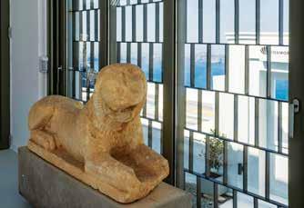 H Top: The atrium of the Archaeological Museum of Thera designed by K. Dekavallas. Right: Archaic lion statue in front of the window of the Archaeological Museum of Thera overlooking the Caldera.