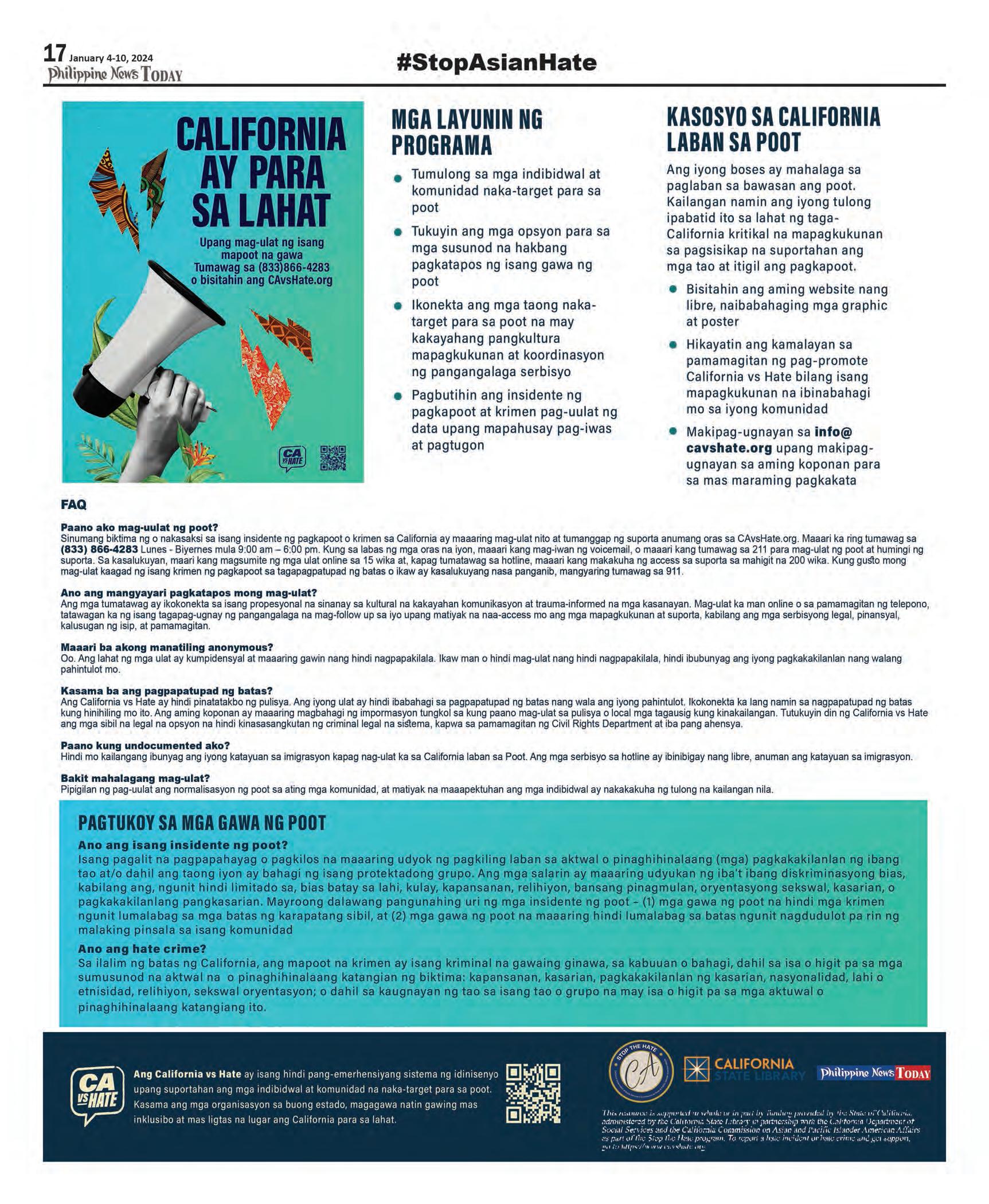 The recent launch of California vs Hate, a non-emergency, multilingual hate crime and incident reporting hotline and online portal, which, in its first six months, received more than 500 reports of hate acts across California.The California Department of Social Services’ Stop the Hate Program, which awards funding to nonprofit organizations to support hate crime prevention and provide services to