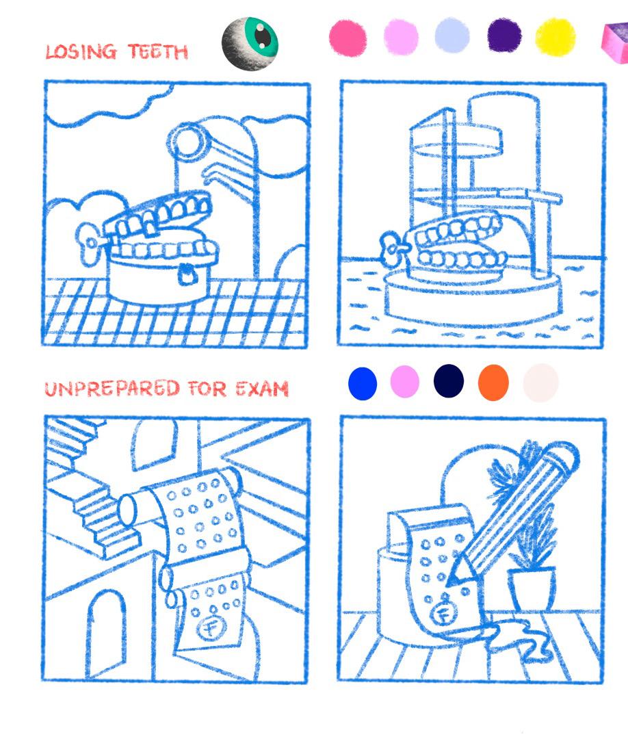 In Sigmund Freud’s The Interpretations of Dreams, there are two layers of meaning of your dreams: manifest content and latent content. The manifest content is the actual literal subject matter of the dream while the latent content is the underlying meaning of these symbols. The latent content of a dream is the hidden psychological meaning of the dream. The GIFs will feature the literal subject matter of the 6 most common dreams (manifest content) that are put in a fantasy dreamscape in order to highlight the unexpected, illog ical juxtaposition–a prevalent characteristic of Surrealism.