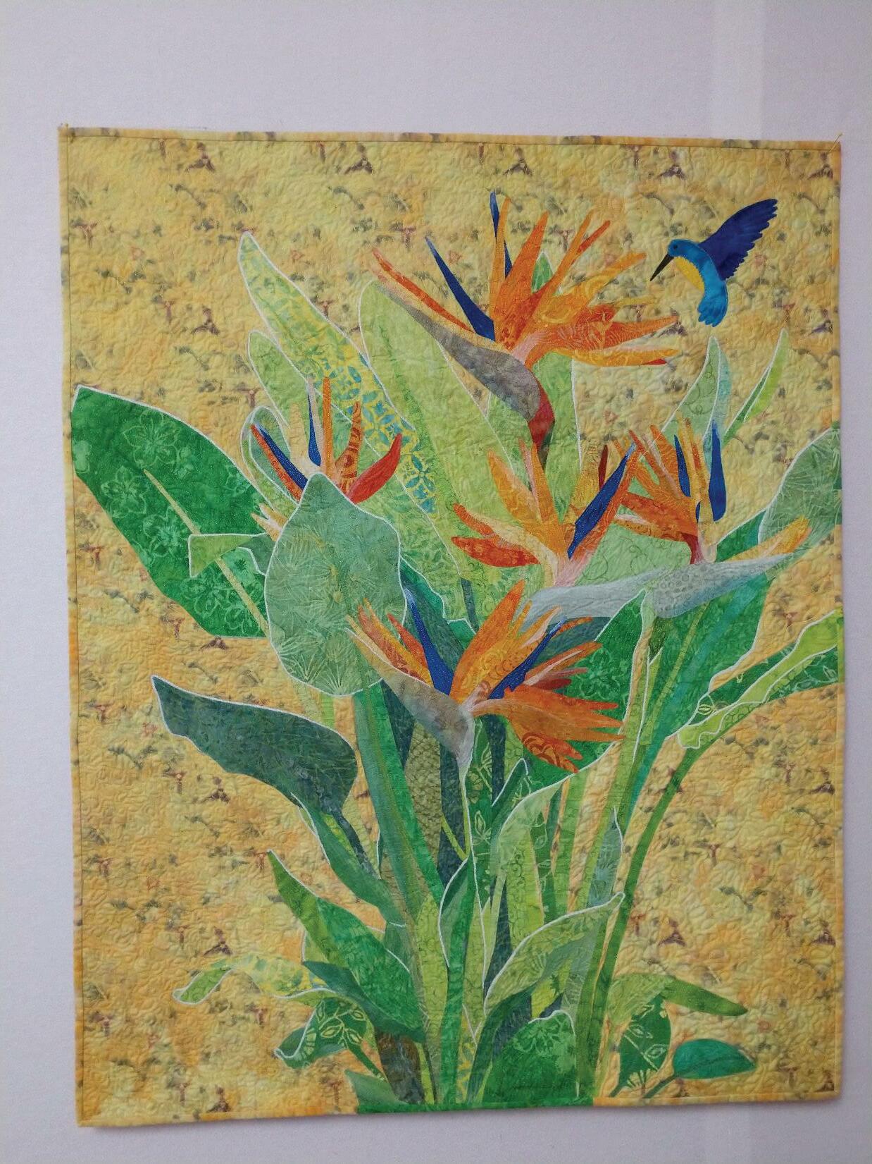Portrait of a Ruby Throated Hum mingbird, based on a photo by my brother-in-law. Utilizes commercial cotton fabrics and thread. The pieces are needle-turned hand appliqued and machine quilted.