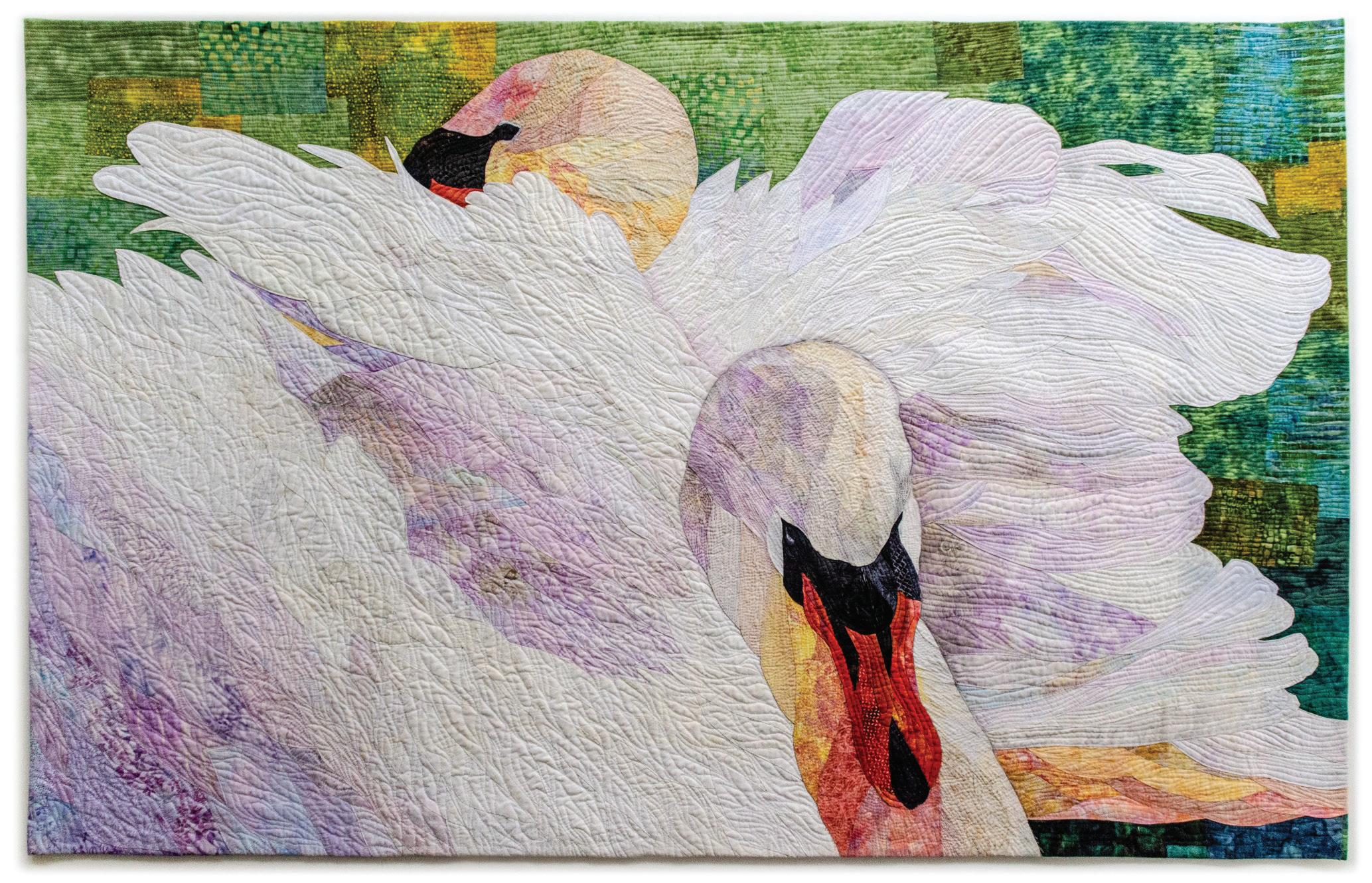 Calmness, serenity, and grace are personal qualities which I admire, but elude me most of the time. Swans remind me of these traits. Calmness, serenity and grace as they glide silent ly through the water, but swans are also powerful birds and therefore symbols of strength and longevity. The juxtaposition of softness and hardness in both life and nature intrigues and inspires me. Needle-turn applique, free-motion quilting.