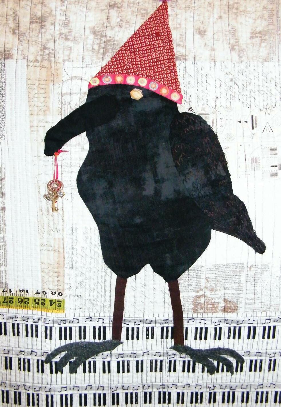 The “Los Tres Amigos” was created as an exercise with in a tiny art group which includes two water col orists an abstract painter and me, an explorer of fiber. We each render our interpretation of an agreed upon theme, in this case a picture of three ibis, using our own medi um. Raw edge appliqué, machine quilting, hand embroidery and stitching with beads on quilting cottons.