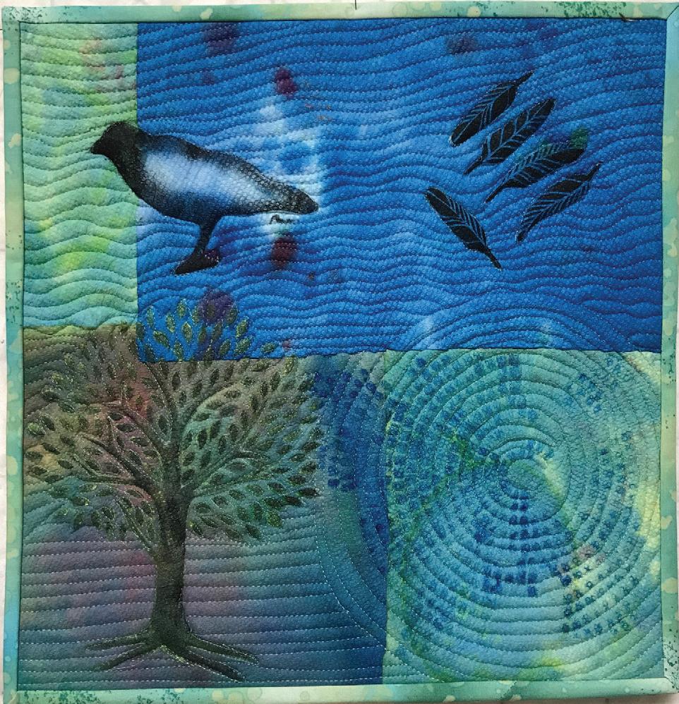Top: Kingfisher, 31” x 19.5” Rivka Hamdani, Israel Quilt made of cotton and tulle fabric. Applique and machine quilting. Based on photo by Shmuel Hamdani, with permission.