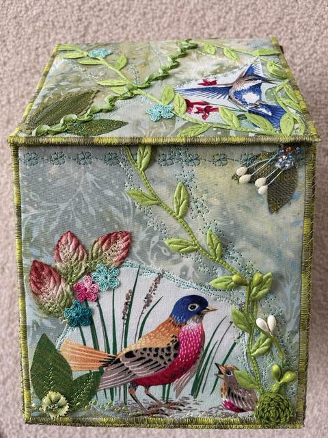 Silk background, tulle hanging loose over the background with fabric and felt birds stitched to the tulle. Machine stitched, machine appli que of tree and birds.
