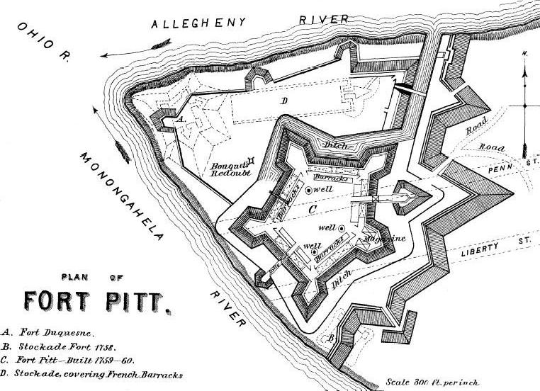 > Fort Pitt Diagram shows Fort Pitt located where the Monongahela and Allegheny rivers join to form the Ohio River.