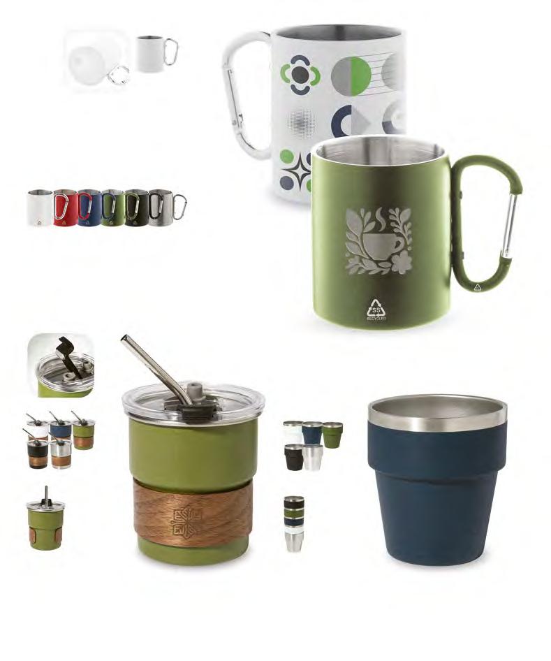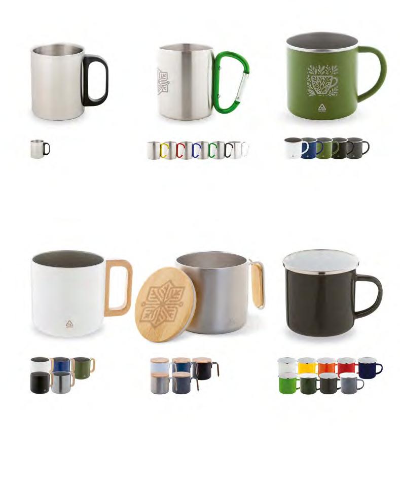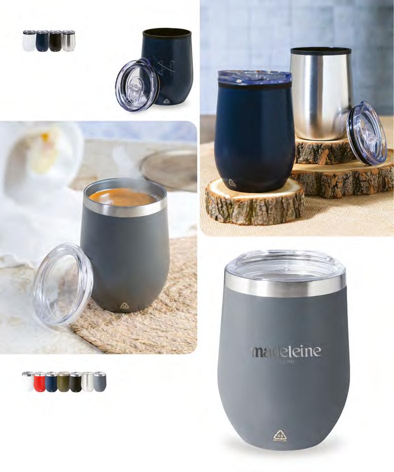 Doppelwandiger, Isolierbecher aus recyceltem Edelstahl mit PPKunststoffaußenseite und Trinkdeckel. Mit RPET-Griffschlaufe. Füllmenge: 350 ml.