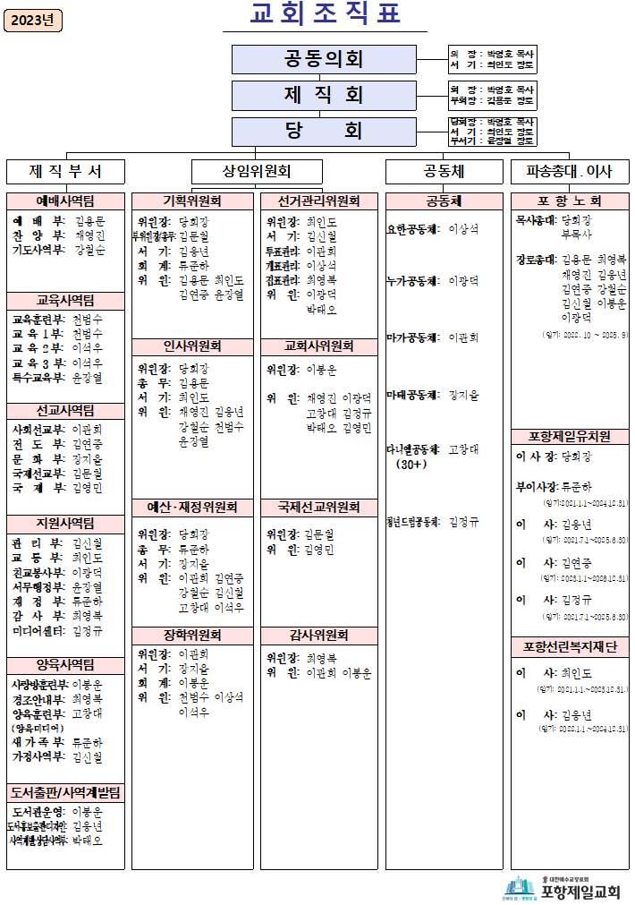 -2목차 교회조직표 ········································································· 3 교회운영규정 제1장총칙 ·························································· 4 제2장당회 4 제3장공동의회 ·························································· 5 제4장제직회 ·························································· 6 제5장교회학교 13 제6장찬양대 ·························································· 14 제7장선교활동단체 ························································ 15 제8장공동체및사랑방 15 제9장재정과자산 ·························································· 16 제10장직원 ·························································· 18 제11장사무국 18 제12장부설기관 ·························································· 20 제13장성도의생활 ·························································· 20 제14장부칙 24 위원회운영규정 1.인사위원회운영규정 ··················································· 27 2.기획위원회운영규정 28 3.장학위원회운영규정 ··················································· 30 4.예산·재정위원회운영규정··················································· 33 5.선거관리위원회운영규정 35 6.감사위원회운영규정 ··················································· 37 7.교회사위원회운영규정 ··················································· 40 8.국제선교위원회운영규정 41 9.교회차량사용규정·························································· 42 10.브리지북카페(도서관)운영규정········································· 43 11.종려나무홀운영규정 45 12.교회식당(만나홀)운영규정············································· 46 13.교회묘지사용규정·························································· 48 14.포항제일교회사회봉사단운영규정 50 15.포항제일유치원정관 ··················································· 52