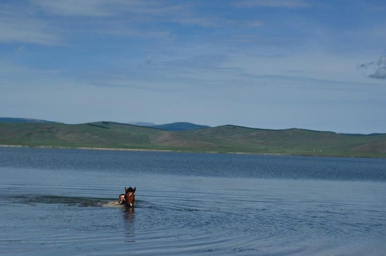 Ráno nás budí slunce a je teplo. Čekám před stanem na kluky, ale oni ne a ne vylézt. Zkontroluji koně, jestli jsou dobře uvázaní a nejsou zamotaní, a pak zase zalézám do spacáku a čekám, až vstanou i kluci. I věci pak balíme pomalu, asi se nám dnes moc nechce nikam jet. Možná je v tom zklamání, že jsme nenašli Tsagaannuur, nebo prostě jen únava, přece jen jsme už nějakou dobu na cestách. Vtom si vzpomenu, jak mi Aleš před odjezdem říkal, že by si rád vyzkoušel plavení koní. Takže mu to navrhnu a on je pro. Jen se ptá: „A jakého koně vezmeme?“