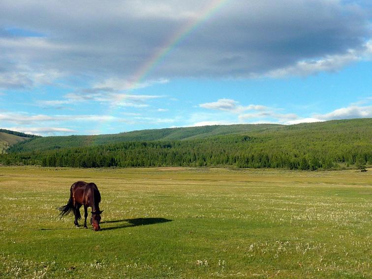 větších problémů. Na druhém břehu uvážeme koně ke kůlům a roztáhneme celtu, protože se spouští další slejvák. Pršet přestává až kolem osmnácté hodiny. Lidé přejíždějící autem přes řeku nám prozradí, že Tsagaannuur je odsud vzdálený dvacet, možná třicet kilometrů. Dnes tam tedy zase nedojedeme. Vyjeté koleje v trávě se místy rozdělují a je těžké určit, která z nich vede směrem, kterým potřebujeme jet. Zeptáme se motorkáře jedoucího v protisměru a ten ukazuje úplně jinam, než kam máme namířeno. Takže to otáčíme, ale protože už toho máme pro dnešek dost, zakempíme u menšího jezera. Odstrojíme koně, napojíme je a necháme je pást se. Voda v jezeře není zrovna čistá, takže ji raději převaříme. Jdu se vykoupat a Aleš zkouší štěstí s prutem. Ale protože nic nechytil, máme k večeři opět houby.